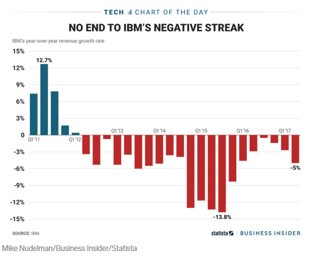 Since 2013 IBM has struggled on both Main Street and Wall Street and this under performance has forced many investors (including legendary investor Warren Buffett) to cut and run from IBM and sell their shares in disgust. This has occurred for the simple reason that IBM’s management has struggled to grow the company’s revenue. Over the last four decades, I have learned one very important lesson as an Analyst and that is that investors on Wall Street hate negative revenue growth more than anything else. IBM has been the poster child of negative revenue growth over the past five years , achieving 21 consecutive quarters of negative revenue growth, before having the streak recently end.