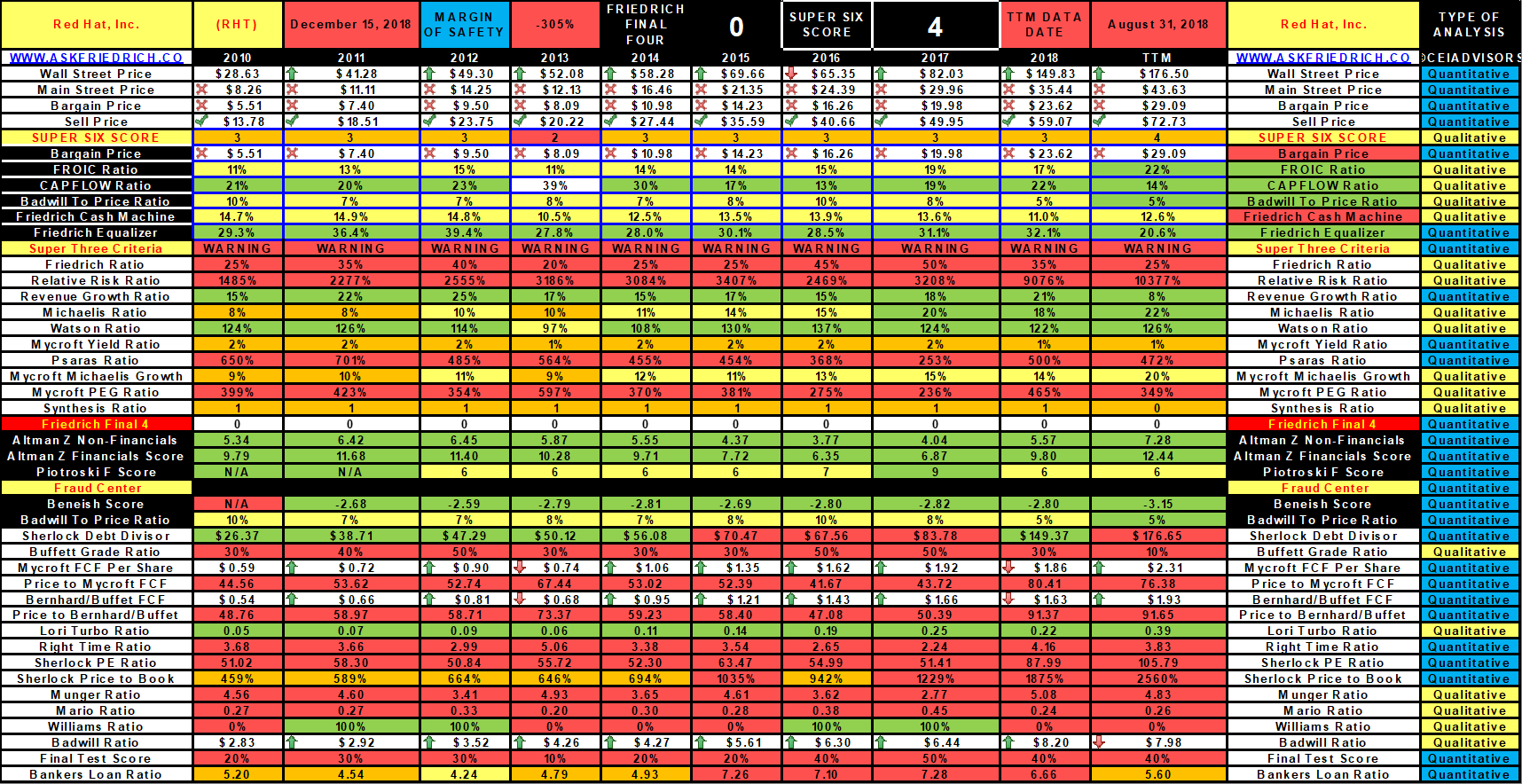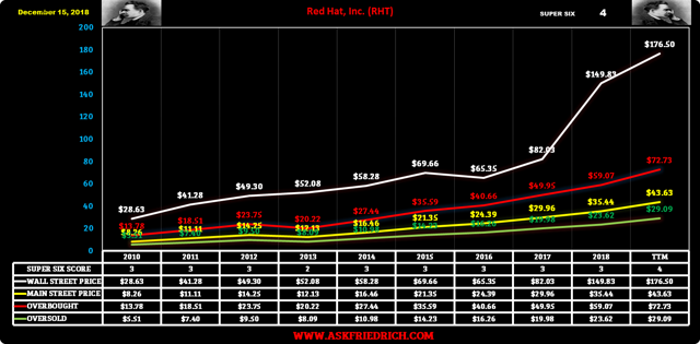 This negative revenue growth rate has unfortunately forced IBM’s management to go outside of the company (in its acquisition of Red Hat), in order to find revenue growth, as it has tried internally for 21 consecutive quarters before eventually doing so. Here is our Friedrich datafile and quantitative chart (not technical chart) of Red Hat (RHT).