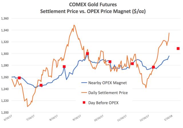 Since June 2017, the futures and OPEX price magnets have tended to converge onr or before the options expiration date. The next option expiration date for COMEX gold is January 25th, 2018.
